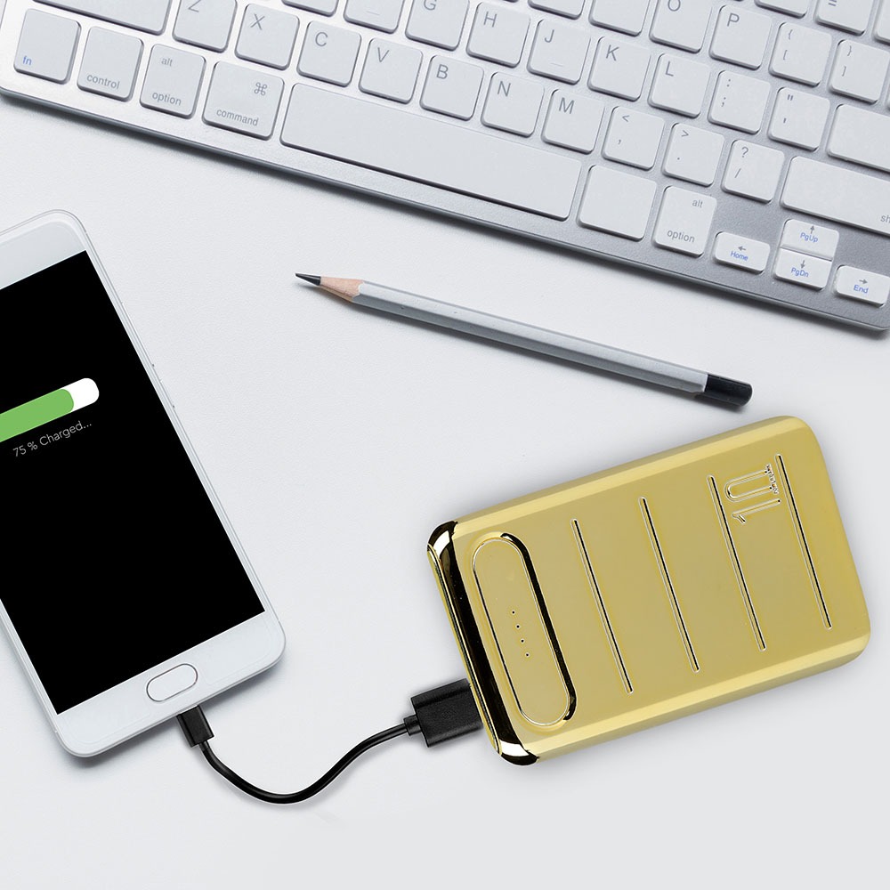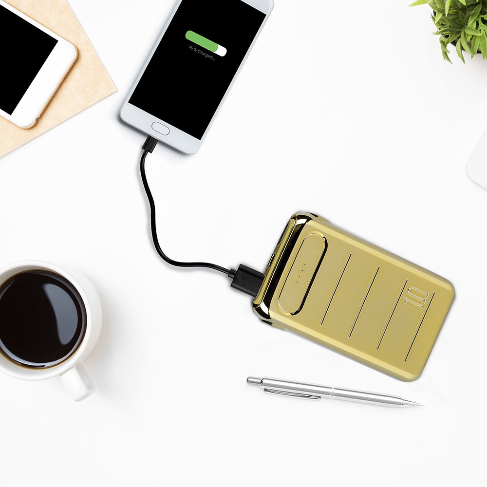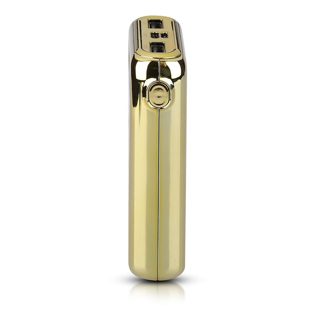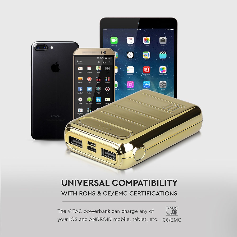 Power Bank von V-TAC, Modell VT-3522, mit 10000mAh Kapazität. Dieser tragbare Power Bank bietet eine Ausgangskapazität von 6500mAh und ist mit zwei USB-Anschlüssen für gleichzeitiges Laden ausgestattet. Die LED-Batterieanzeige informiert über den aktuellen Ladezustand. Maße: 100mm x 38mm x 200mm, Gewicht: 0,27kg. Enthält ein Ladekabel für die Power Bank. Eigenschaften: 10K Gold beschichtet, Dual-Eingang: USB Typ C und Micro-USB.