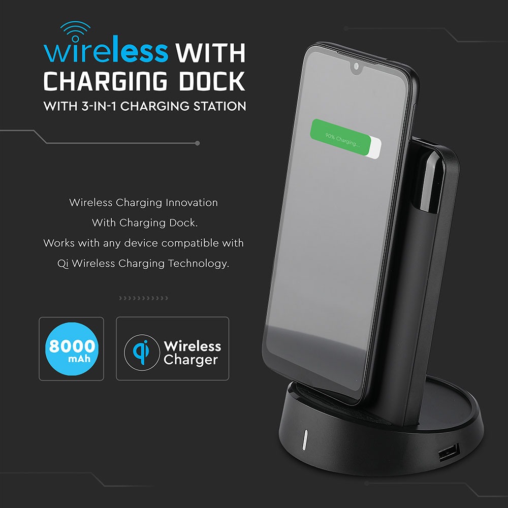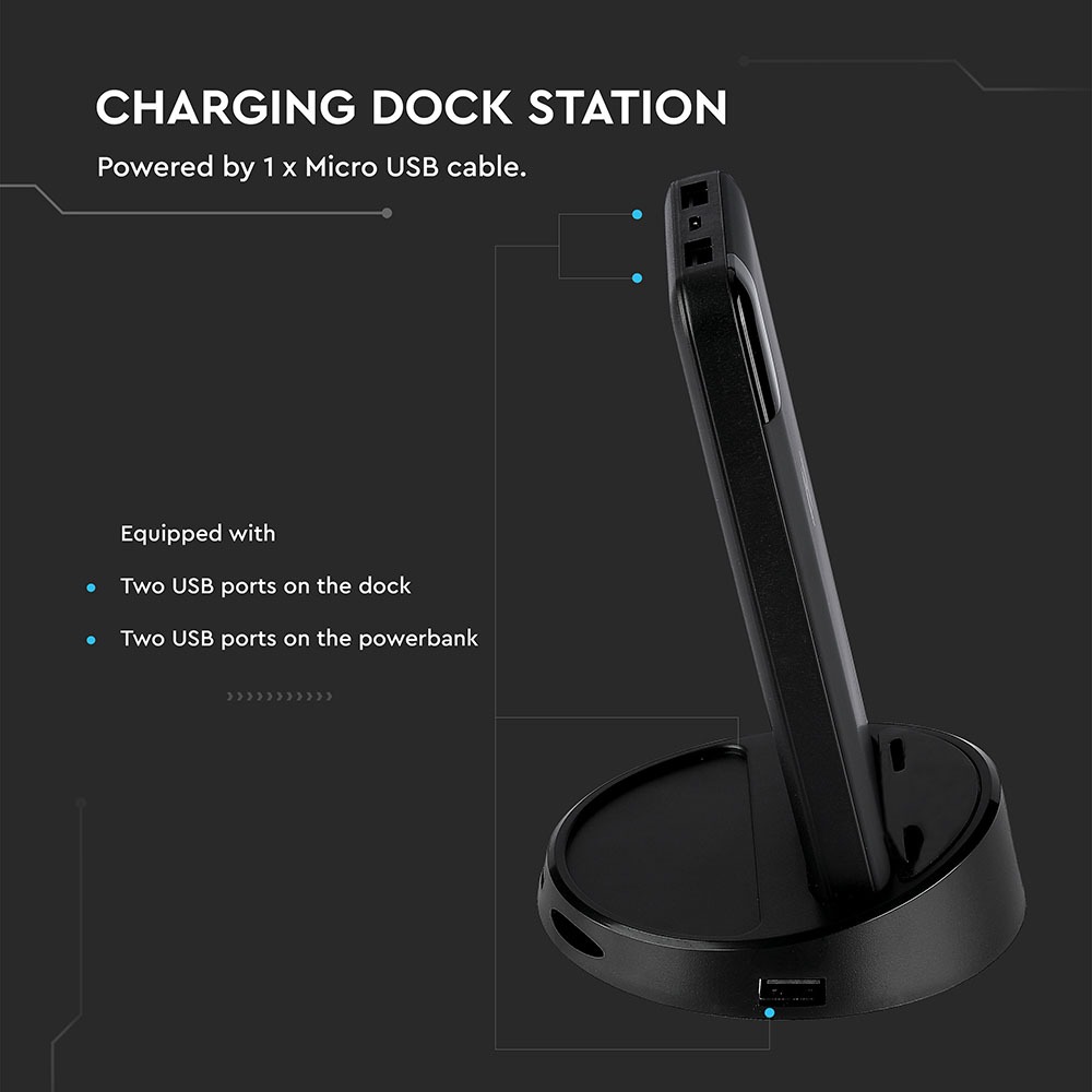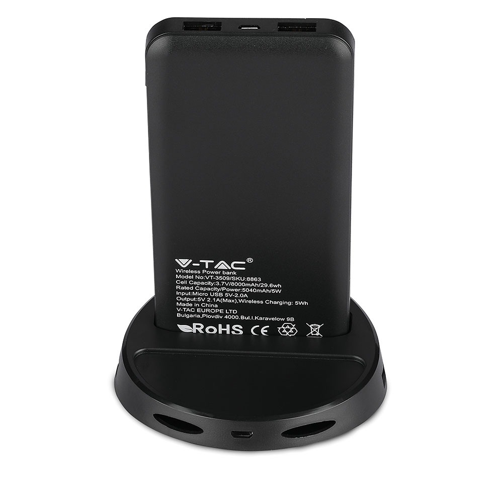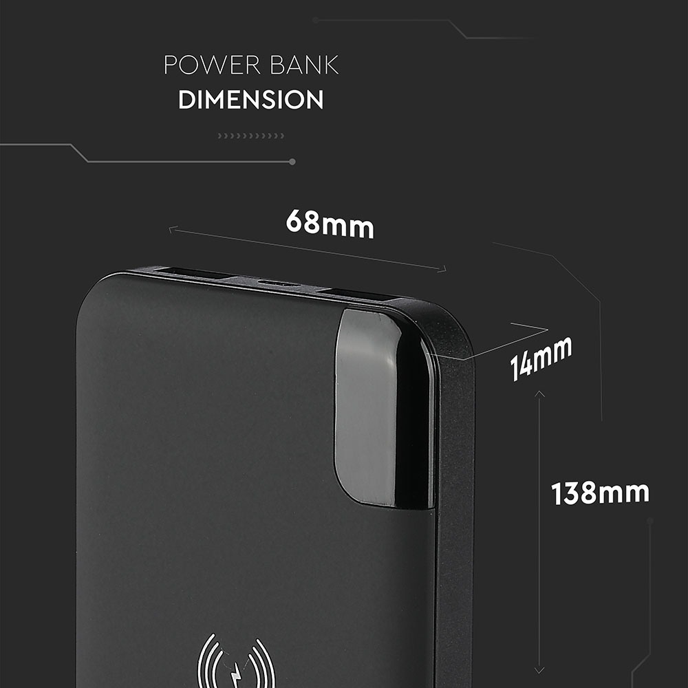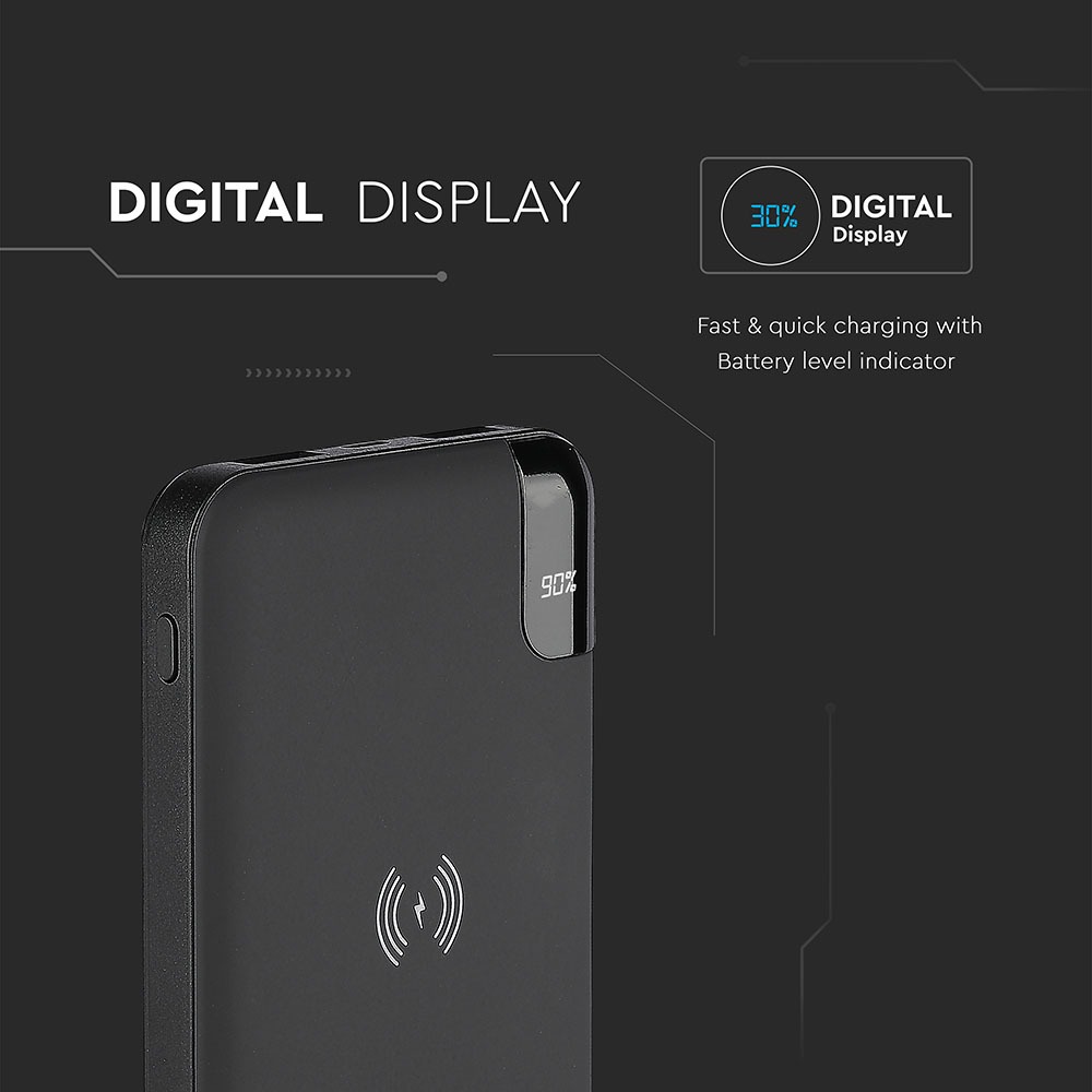 Power Bank von V-TAC, Modell VT-3509-B, mit einer Kapazität von 5040mAh. Dieser tragbare Akku bietet kabelloses Laden mit 5W Leistung. Er verfügt über zwei USB-Anschlüsse für gleichzeitiges Laden und ein digitales Display zur Anzeige des Batteriestatus. Die Abmessungen betragen 130 mm x 50 mm x 170 mm bei einem Gewicht von 0,0012 kg. Ideal für das Laden von Smartphones und Tablets.