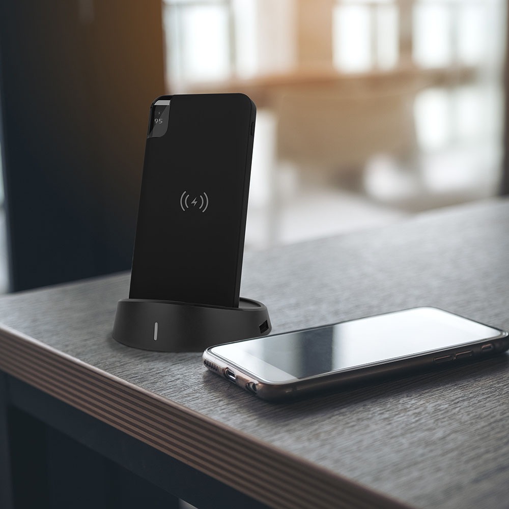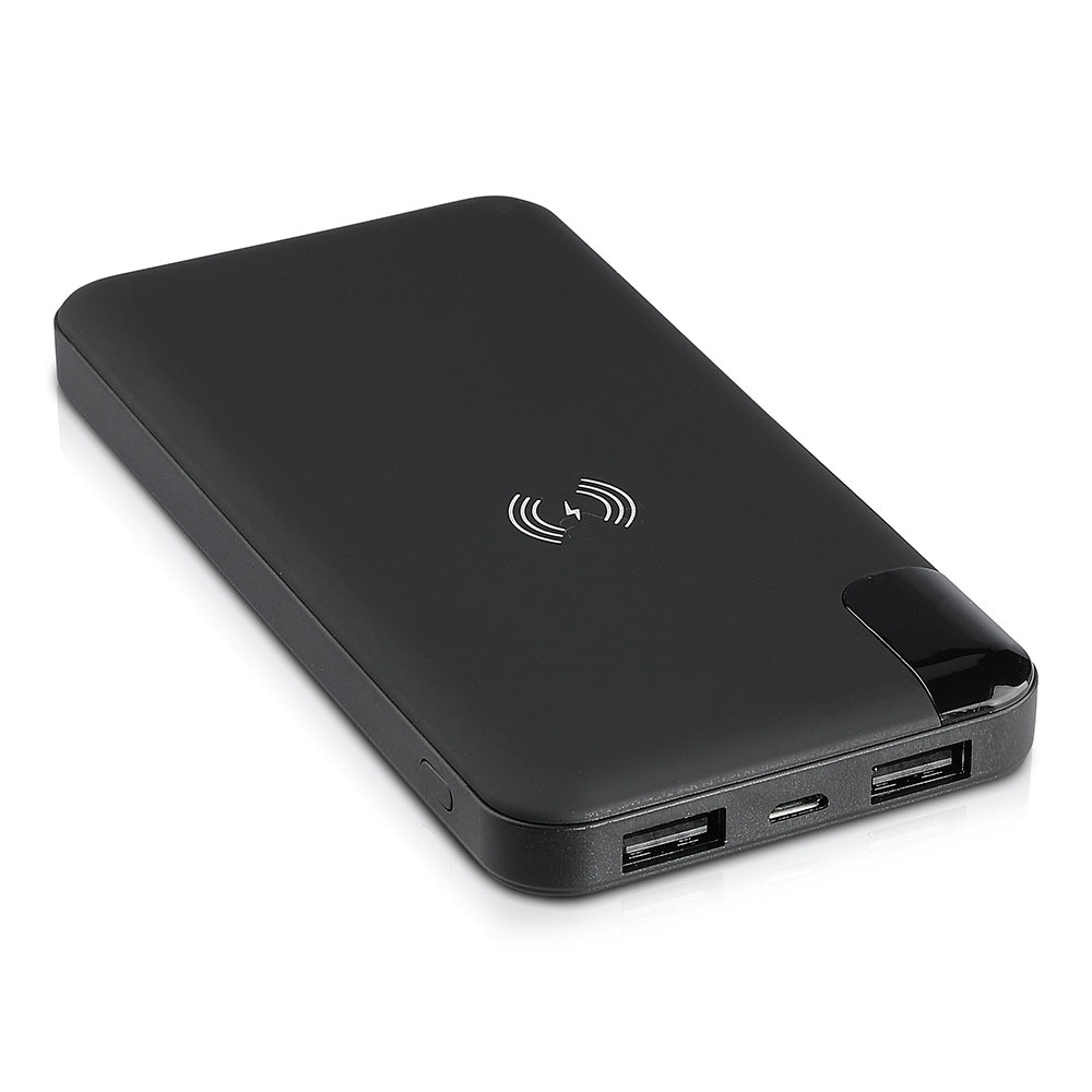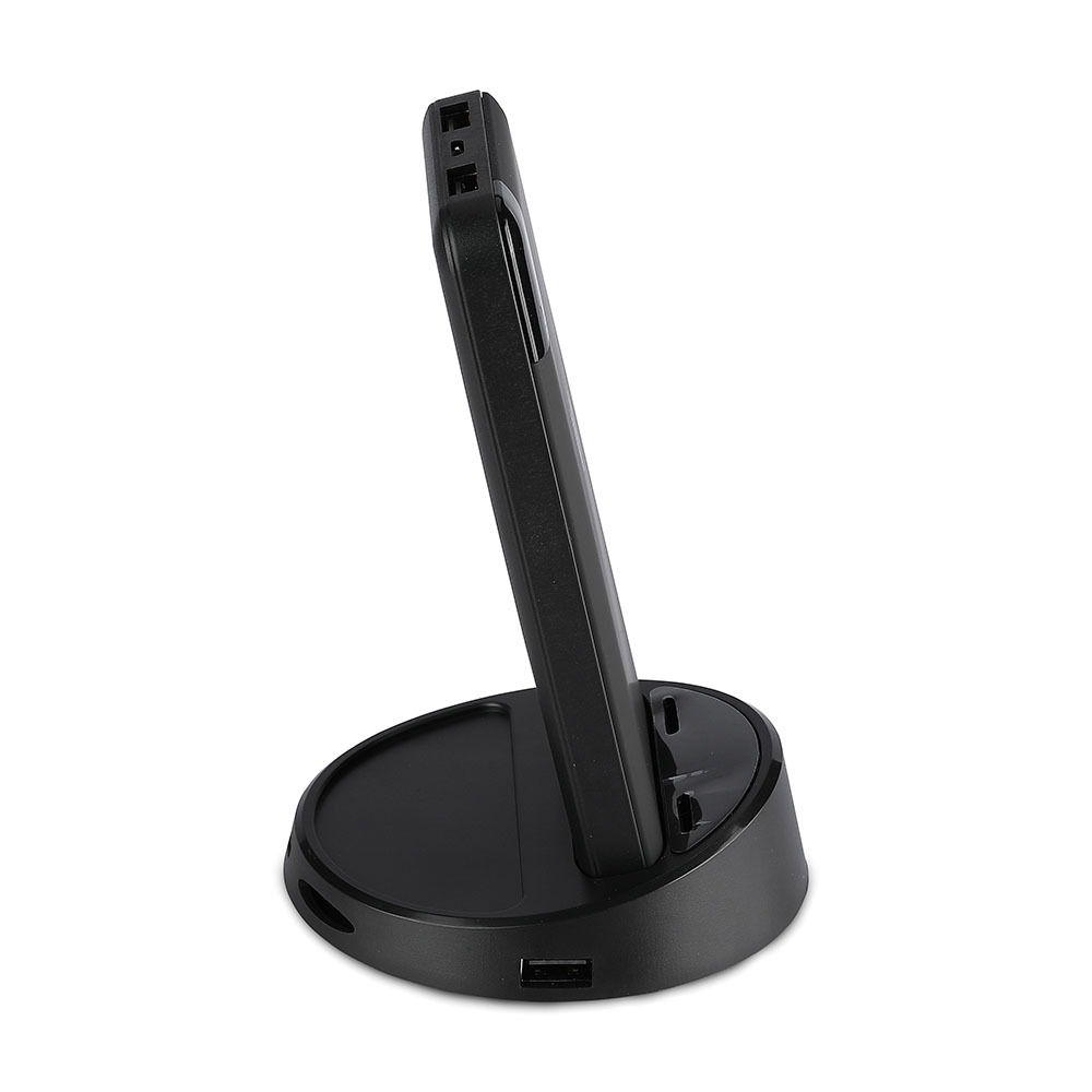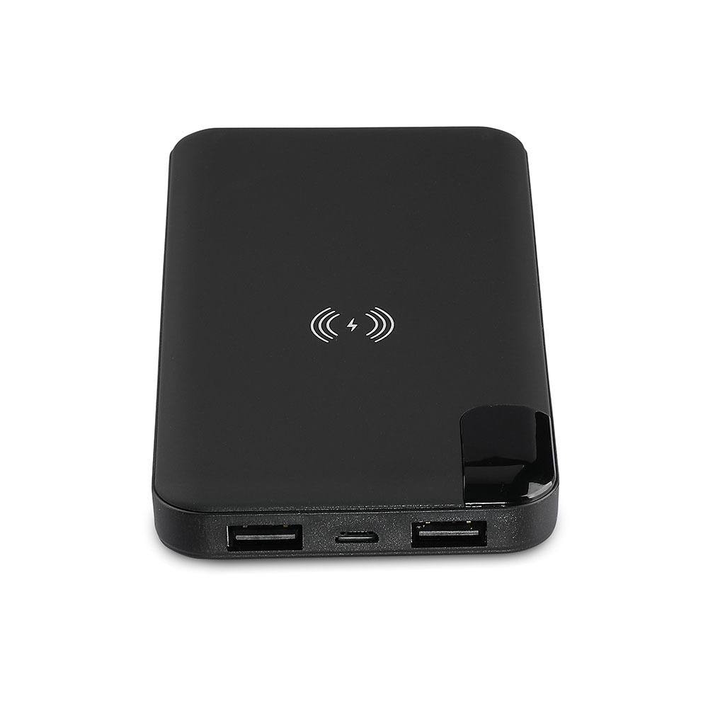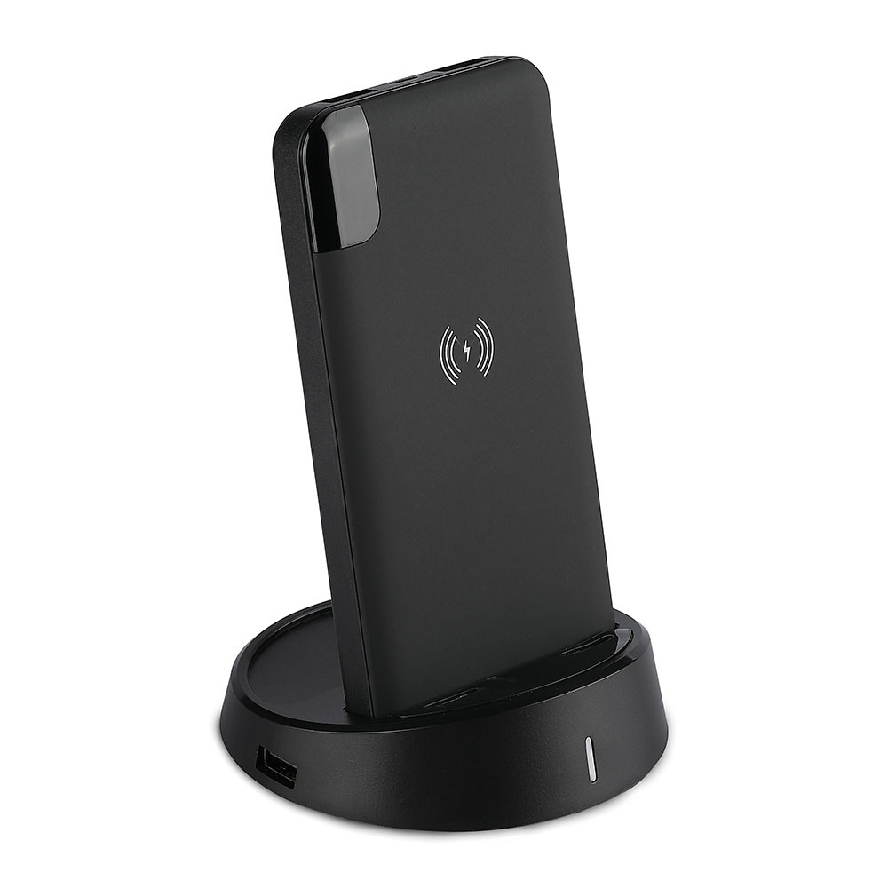Power Bank von V-TAC, Modell VT-3509-B, mit einer Kapazität von 5040mAh. Dieser tragbare Akku bietet kabelloses Laden mit 5W Leistung. Er verfügt über zwei USB-Anschlüsse für gleichzeitiges Laden und ein digitales Display zur Anzeige des Batteriestatus. Die Abmessungen betragen 130 mm x 50 mm x 170 mm bei einem Gewicht von 0,0012 kg. Ideal für das Laden von Smartphones und Tablets.