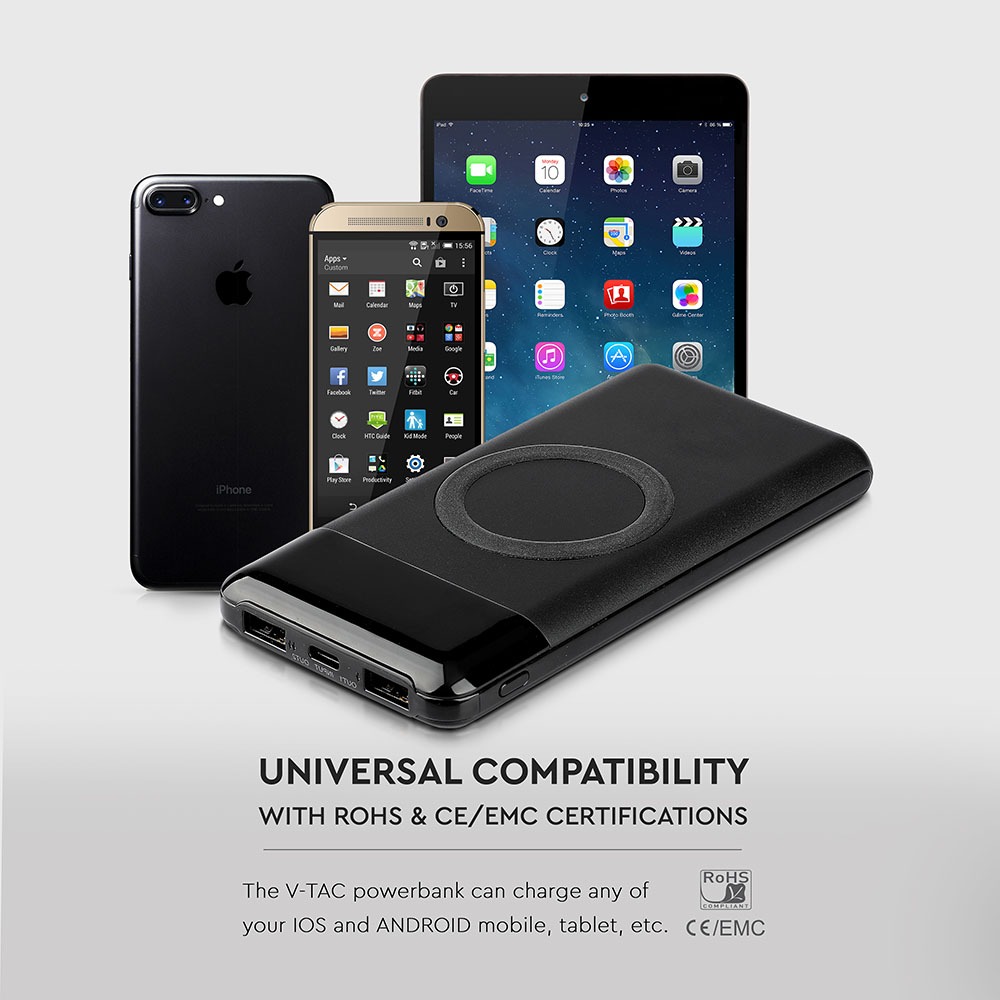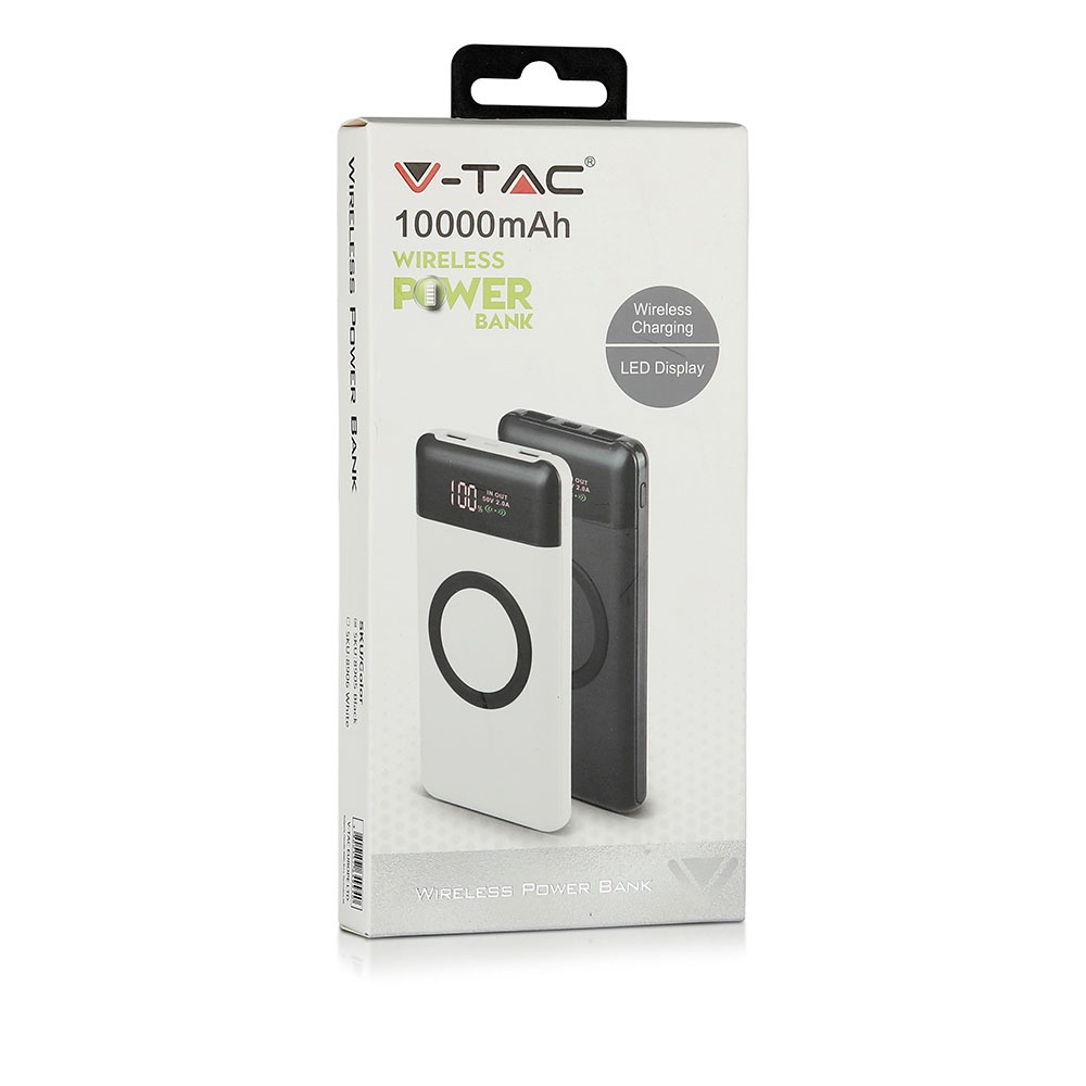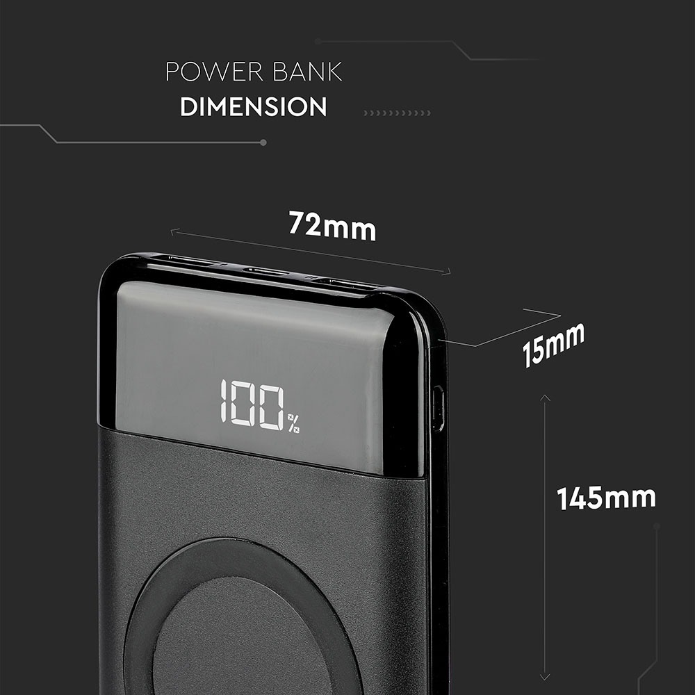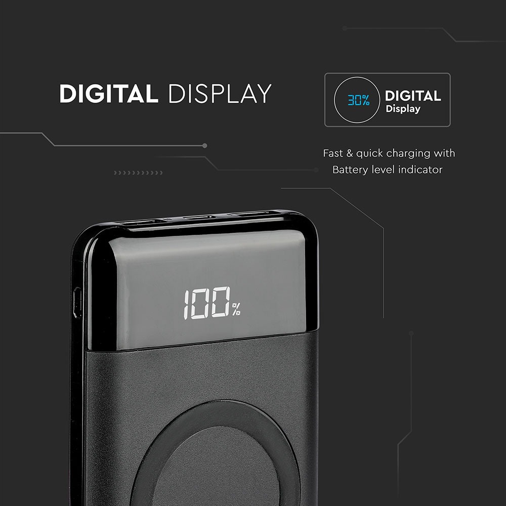 Power Bank von V-TAC, Modell VT-3521-B, mit einer Kapazität von 6500mAh. Diese Power Bank bietet kabelloses Laden mit 5W und verfügt über zwei USB-Anschlüsse für gleichzeitiges Laden. Sie ist mit einem digitalen Batteriestatusanzeige ausgestattet. Die Abmessungen betragen 90mm x 22mm x 180mm und das Gewicht liegt bei 0,265kg. Ideal für das einfache Laden von Smartphones und Tablets.