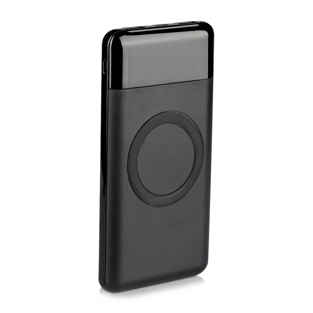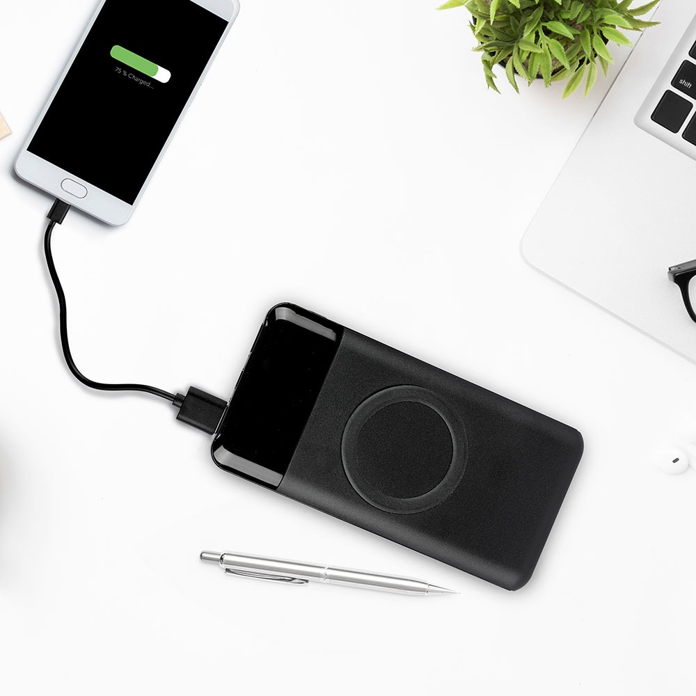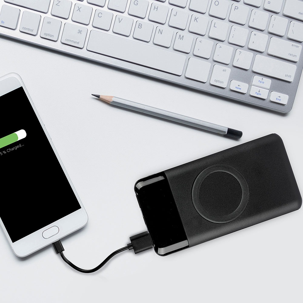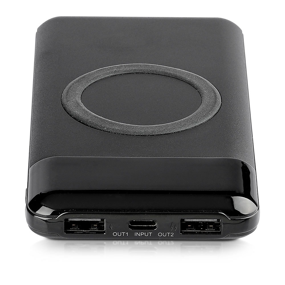 Power Bank von V-TAC, Modell VT-3521-B, mit einer Kapazität von 6500mAh. Diese Power Bank bietet kabelloses Laden mit 5W und verfügt über zwei USB-Anschlüsse für gleichzeitiges Laden. Sie ist mit einem digitalen Batteriestatusanzeige ausgestattet. Die Abmessungen betragen 90mm x 22mm x 180mm und das Gewicht liegt bei 0,265kg. Ideal für das einfache Laden von Smartphones und Tablets.