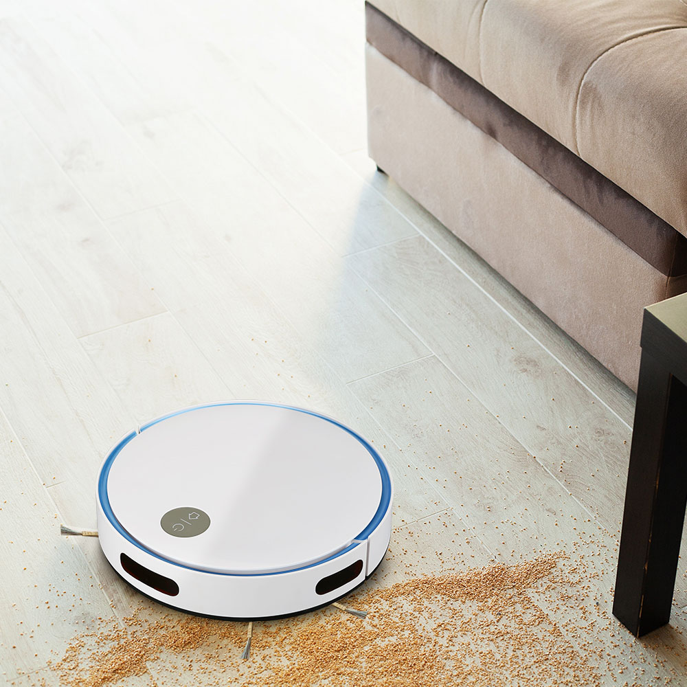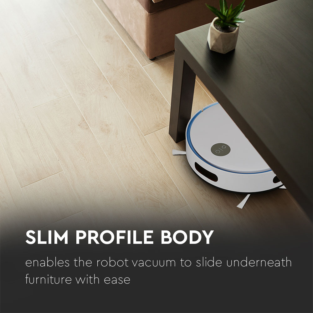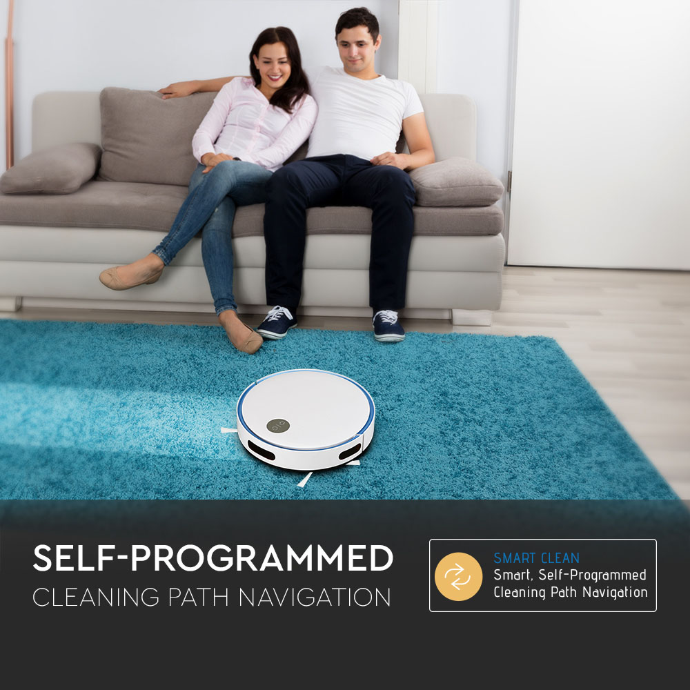 Saugroboter von V-TAC, Modell VT-5522, mit einer Leistung von 800W. Der Saugroboter bietet eine Staubbehälterkapazität von 430ml und deckt eine Reinigungsfläche von bis zu 120 Quadratmetern ab. Er verfügt über mehrere Reinigungsmodi, darunter Auto, Spot und Rand, sowie Anti-Fall- und Anti-Kollisionssensoren. Die Geräuschentwicklung liegt unter 65dB, und der Saugroboter ist für verschiedene Bodenbeläge geeignet, einschließlich Holz, Fliesen und Teppich. Weitere Merkmale sind die einfache Bedienung mit einem Knopf und der integrierte HEPA-Filter.