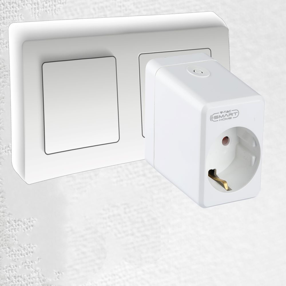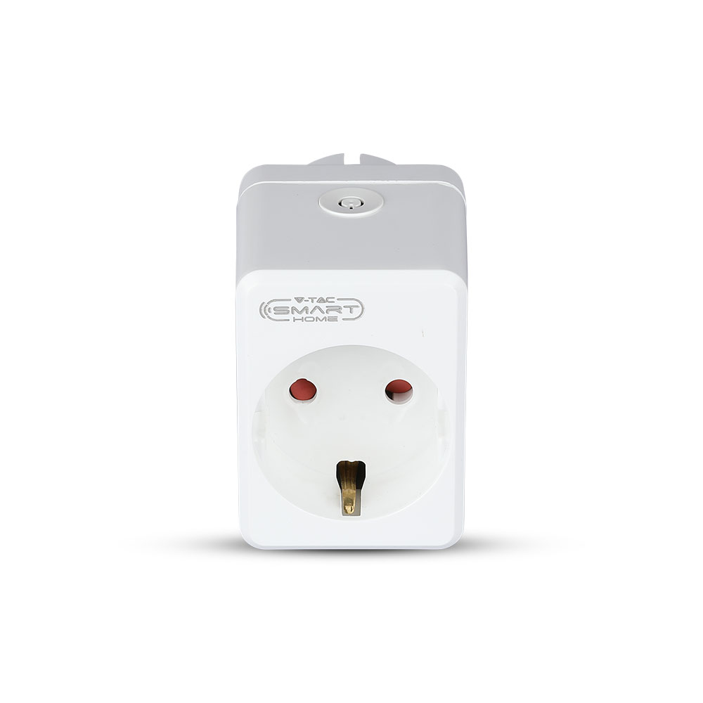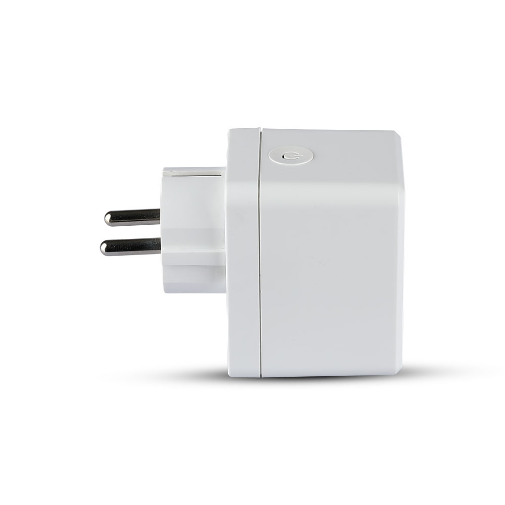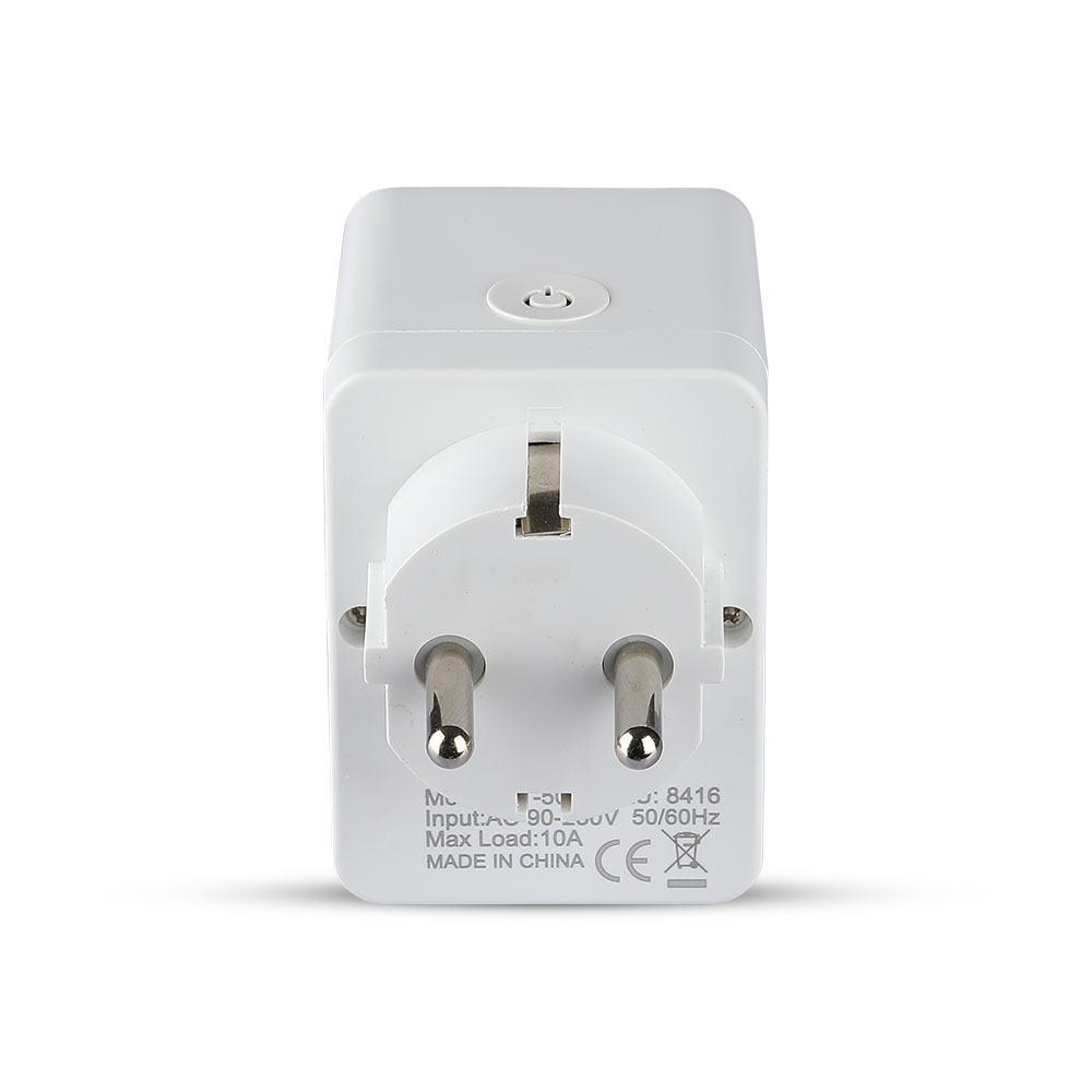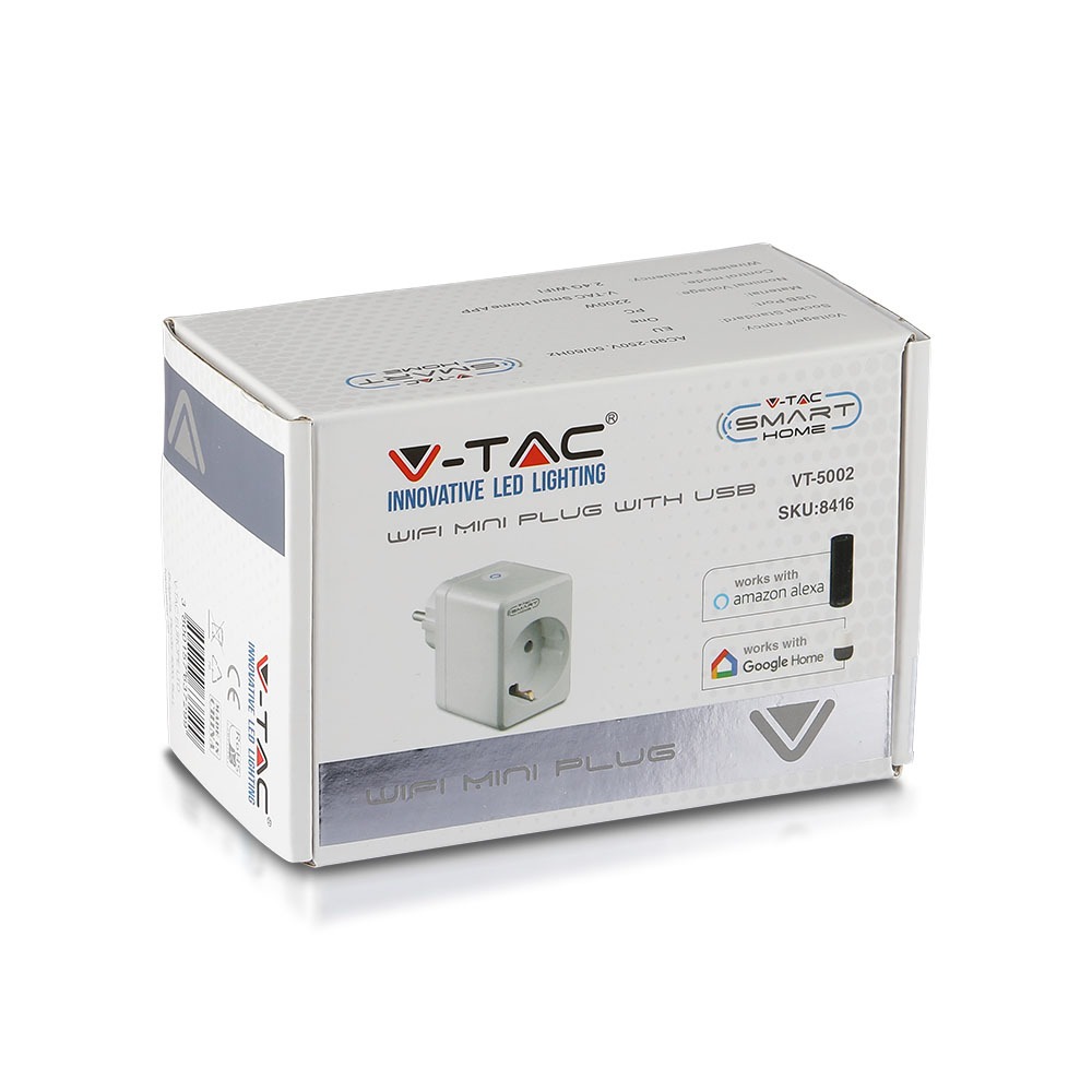 Smart Stecker von V-TAC, Modell VT-5002, mit einer maximalen Leistung von 2200W. Der Stecker ist mit einem USB-Anschluss ausgestattet und ermöglicht die Steuerung über die eWeLink-App sowie Alexa und Google Home. Er unterstützt eine drahtlose Frequenz von 2,4GHz und ist einfach zu installieren und mit der App zu koppeln. Die Maße betragen 50mm x 70mm x 100mm und das Gewicht liegt bei 0,119kg. Der Stecker ist für den Einsatz in Smart Homes konzipiert.