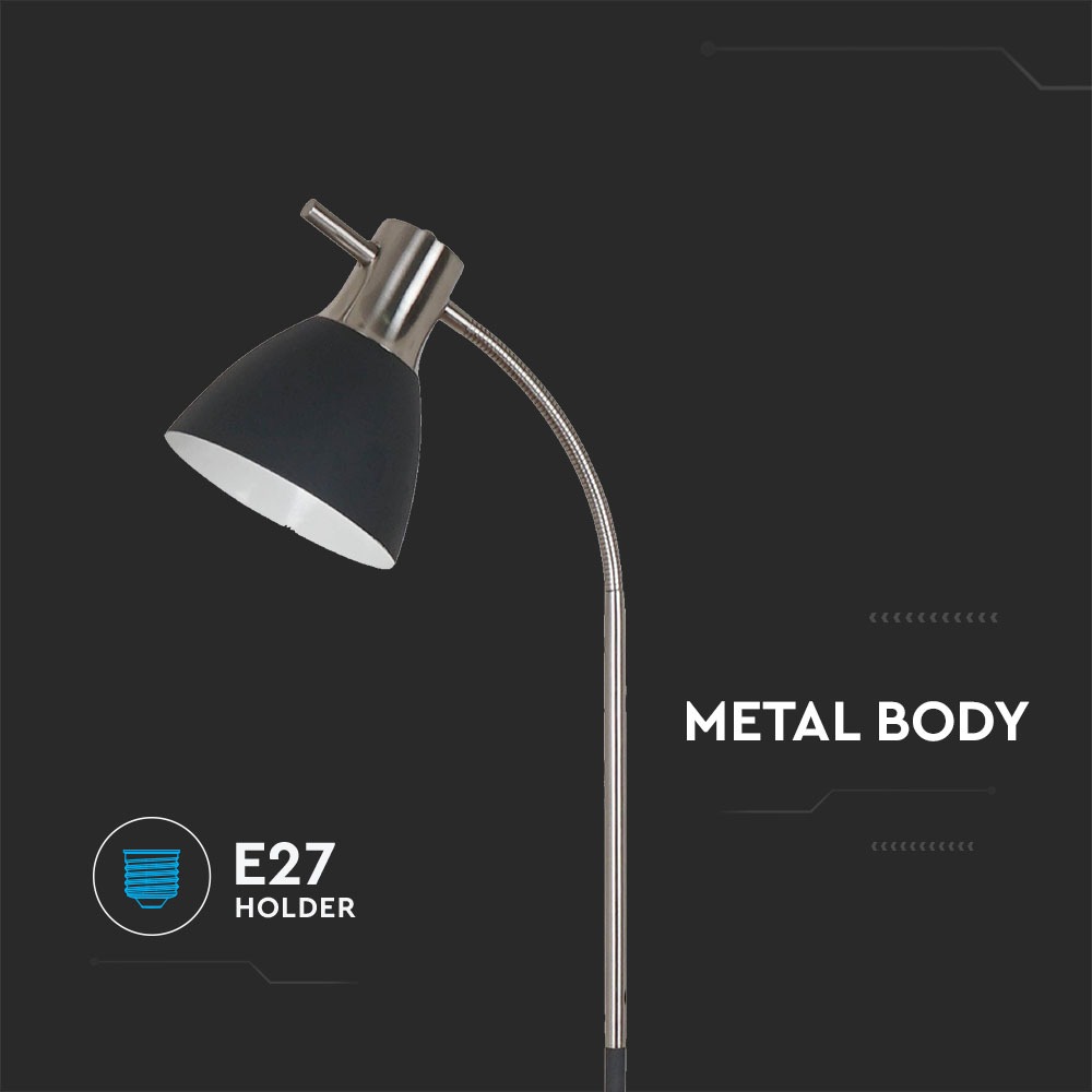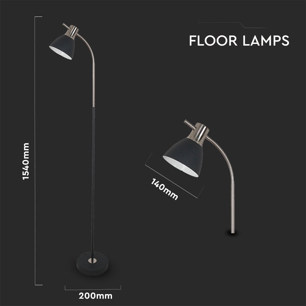 Stehlampe von V-TAC, Modell VT-7402, geeignet für moderne Innenräume. Die Lampe hat eine maximale Leistung von 60 Watt und ist mit einem E27 Sockel ausgestattet (Glühbirne nicht enthalten). Sie verfügt über ein elegantes Design in Schwarz und Chrom und ist aus robustem Metall gefertigt. Die Stehlampe ist ideal für Hotels, Wohnräume, Restaurants und gewerbliche Beleuchtung. Die Montage ist einfach und das Produkt hat eine Garantie von 5 Jahren.