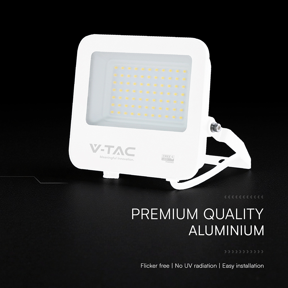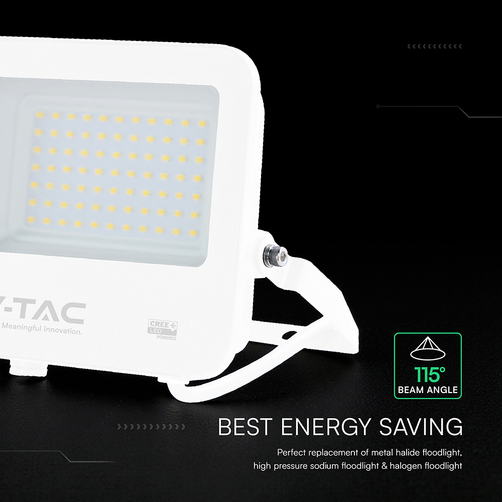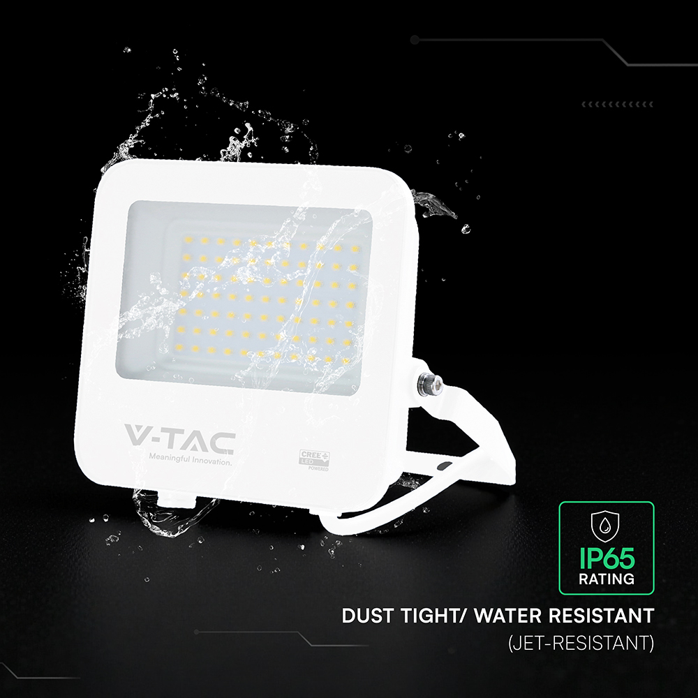 Der LED-Strahler von V-TAC, Modell VT-4455-W, bietet eine Leistung von 50 Watt und eignet sich ideal für den Einsatz im Außenbereich. Mit einer Lichtausbeute von 6750 Lumen und einer Effizienz von 135 lm/W sorgt er für eine gleichmäßige Ausleuchtung. Der Strahler hat eine Farbtemperatur von 4000K und einen Farbwiedergabeindex von über 70, bei einem Abstrahlwinkel von 115°. Dank der Schutzart IP65 ist er gegen Wasser und Staub geschützt und hat eine Lebensdauer von 30.000 Stunden. Die Abmessungen betragen 190 x 39 x 174 mm bei einem Gewicht von 0,58 kg. Der Strahler ist aus korrosionsbeständigem Aluminium gefertigt und bietet eine Garantie von 6 Jahren.