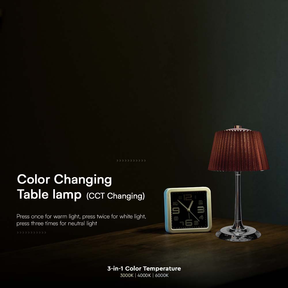 Tischlampe von V-TAC, Modell VT-7968-CB, mit einer Leistung von 1,5 Watt. Sie bietet eine Lichtausbeute von 40 Lumen und einen Abstrahlwinkel von 180°. Die Lampe hat eine Schutzart von IP20 und ist für den Einsatz in Schlafzimmern, Wohnzimmern und Büros geeignet. Die Abmessungen betragen 150 mm x 150 mm x 300 mm und das Gewicht liegt bei 0,64 kg. Die Lampe verfügt über eine Touch-Steuerung zur Helligkeitsregelung und einen USB-Ladeanschluss Typ C mit 5V, 2A.