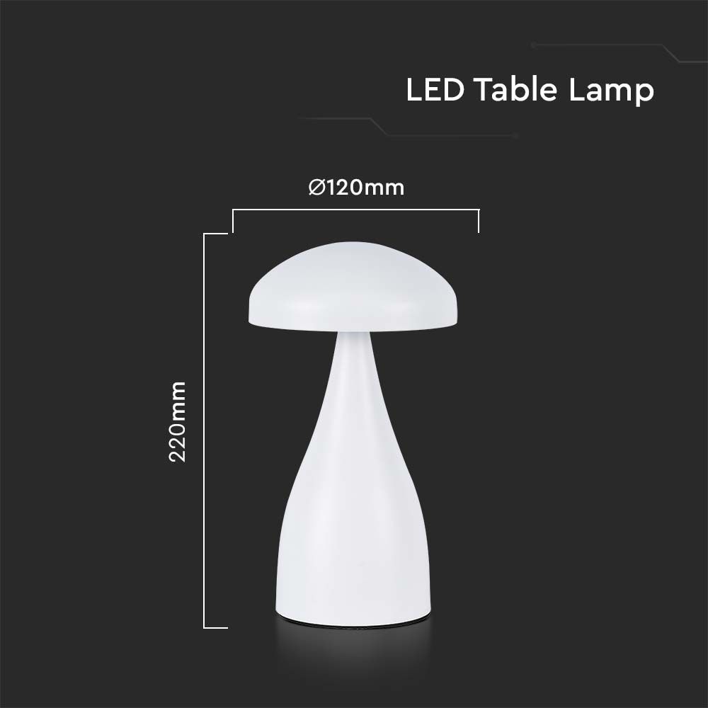 Tischlampe von V-TAC, Modell VT-1041-W, mit einer Leistung von 1W, geeignet für moderne Innenräume. Sie bietet eine Lichtleistung von 55 Lumen und einen Abstrahlwinkel von 120°. Die Lampe hat eine elegante weiße Farboberfläche und ist aus robustem Metall gefertigt. Die Maße betragen 155 mm x 155 mm x 235 mm und das Gewicht liegt bei 0,62 kg. Sie ist mit einer Touch-Dimmfunktion ausgestattet und eignet sich für Schlafzimmer, Wohnzimmer und Büros.