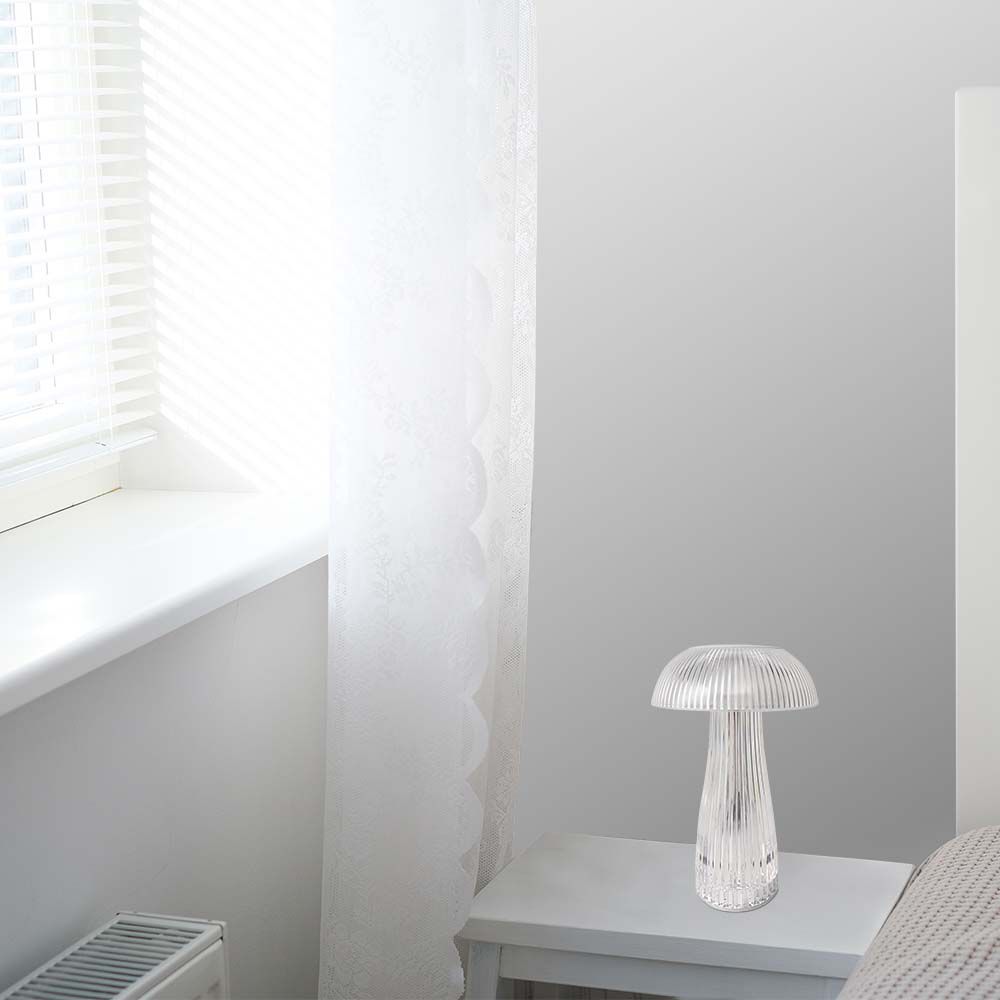 Tischlampe von V-TAC, Modell VT-1040-T, mit einer Leistung von 1W, geeignet für moderne Innenräume. Sie bietet eine Lichtleistung von 50 Lumen und einen Abstrahlwinkel von 180°. Die Lampe hat eine IP-Schutzart von IP20 und eine Garantie von 2 Jahren. Die Abmessungen betragen 185 mm x 185 mm x 275 mm und das Gewicht liegt bei 0,736 kg. Sie verfügt über eine Touch-Dimmfunktion und ist in einem eleganten transparenten Farbfinish erhältlich.