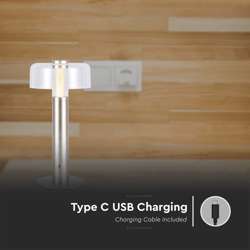 Tischlampe von V-TAC, Modell VT-1049-M2, mit einer Leistung von 1W, geeignet für moderne Innenräume. Die Lampe bietet eine Farbtemperatur von 3000K und einen Abstrahlwinkel von 300°. Sie ist aus robustem Metall und Acryl gefertigt und hat eine Lebensdauer von 2 Jahren. Die Maße betragen 185mm x 185mm x 330mm und das Gewicht liegt bei 1,05 kg. Die Lampe verfügt über eine Touch-Dimmfunktion und wird mit einem Typ C USB-Kabel geliefert.