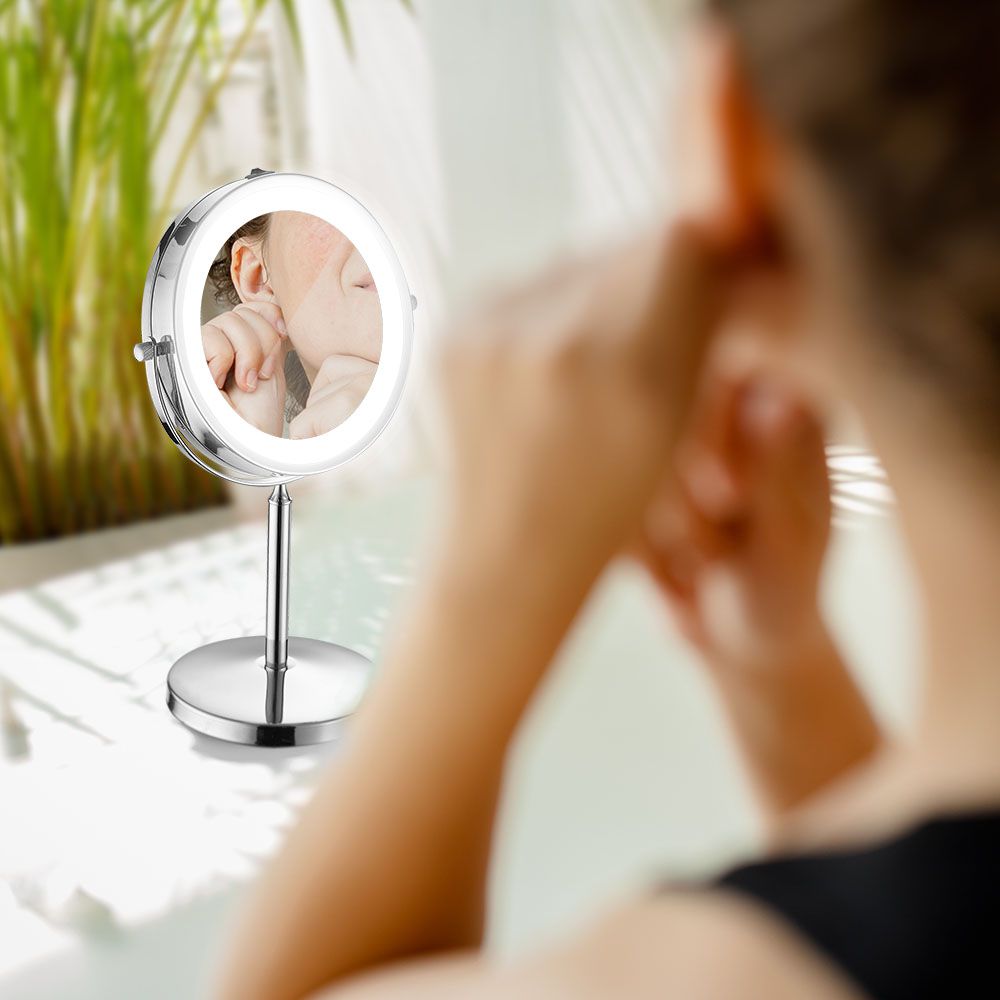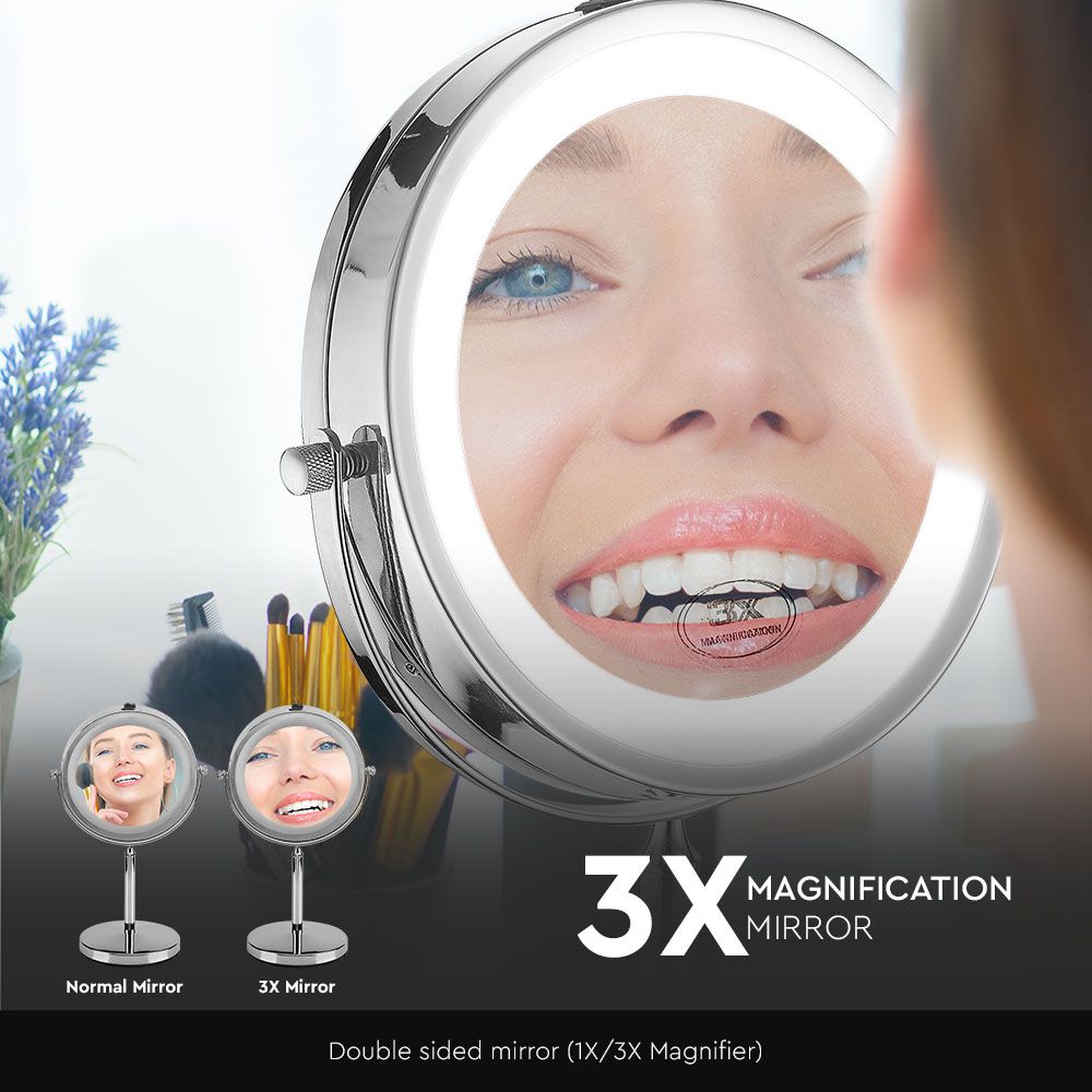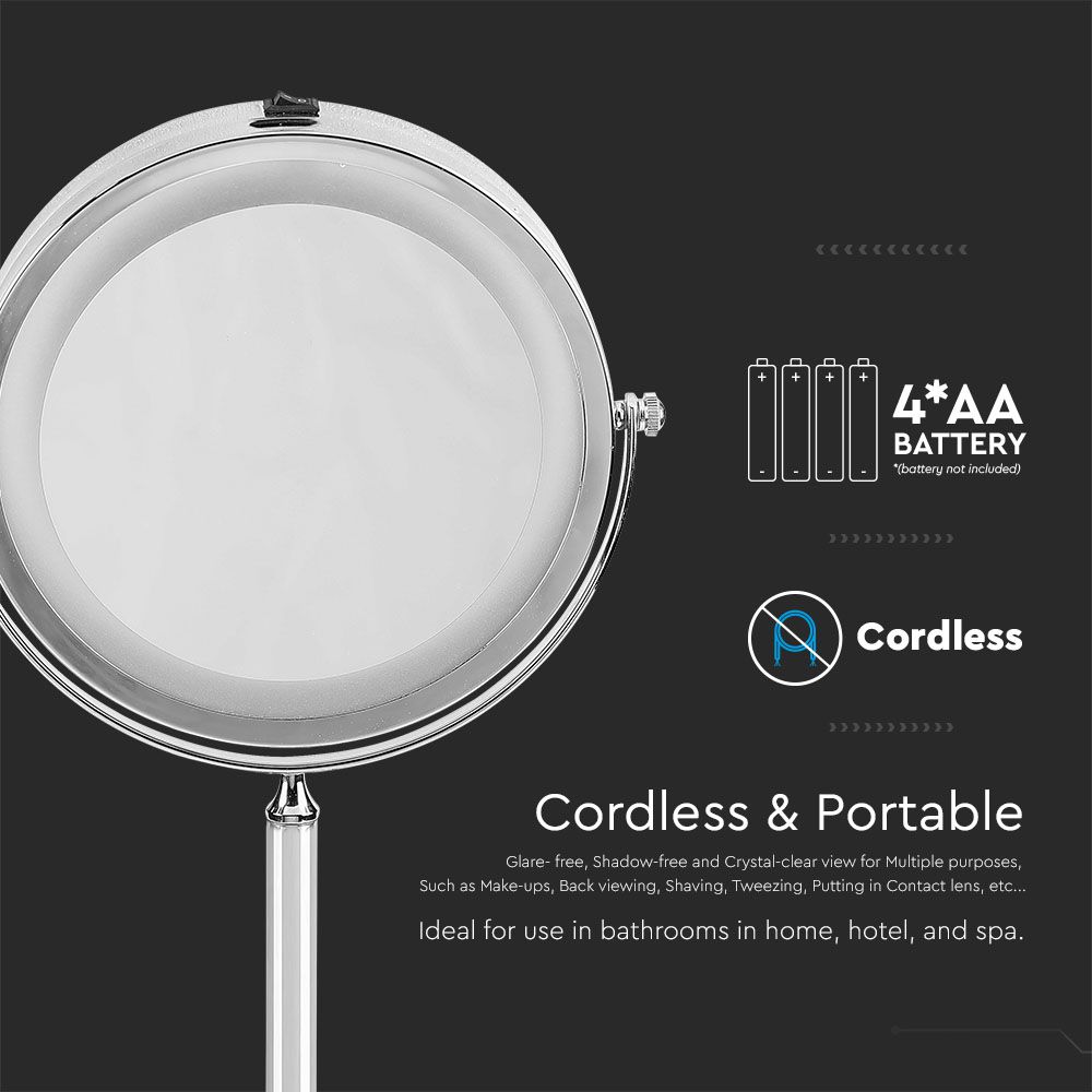 Tischspiegelleuchte von V-TAC, Modell VT-7572, mit einer Leistung von 3 Watt. Sie bietet eine Lichtstärke von 30 Lumen und hat eine Farbtemperatur von 6400K sowie einen Abstrahlwinkel von 150°. Die Leuchte ist IP44 klassifiziert und eignet sich für den Einsatz in Badezimmern, Hotels und Spas. Die Maße betragen 65 mm in der Länge und 300 mm in der Breite, das Gewicht liegt bei 1,12 kg. Die Leuchte ist kabellos und tragbar, bietet eine blendfreie und schattenfreie Sicht für verschiedene Anwendungen wie Make-up, Rasur und das Einsetzen von Kontaktlinsen.