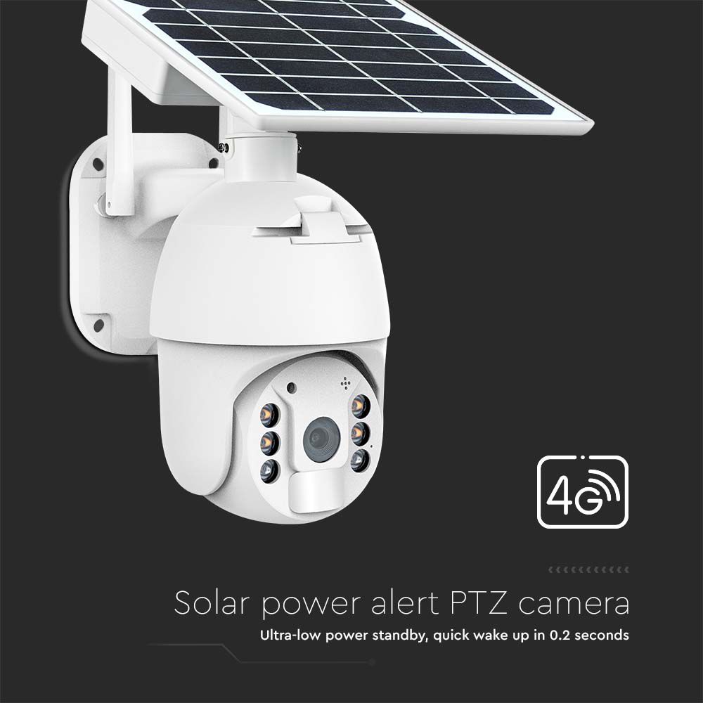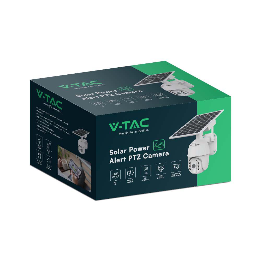 Überwachungskamera von V-TAC, Modell VT-11024-4G, mit einer Leistung von 4W, geeignet für den Außenbereich. Diese Kamera bietet eine 360° VR-Funktion mit PIR-Erkennung und einem Sichtwinkel von 95°. Sie verfügt über eine Auflösung von 2MP (1920x1080) und eine elegante weiße Farboberfläche. Die Kamera ist mit einem IP65-Schutz ausgestattet, was sie wetterfest macht. Weitere Merkmale sind die Sprachüberwachung und die Nachtsicht in voller Farbe.