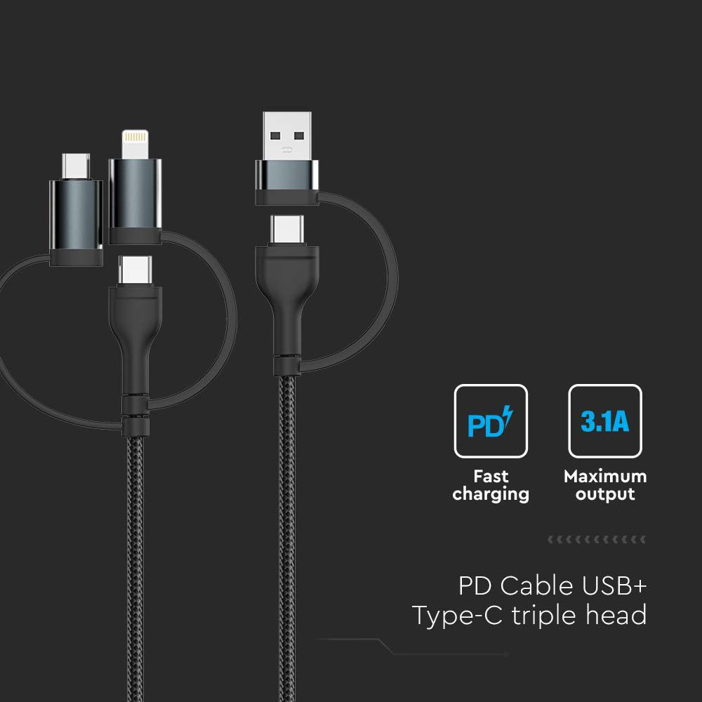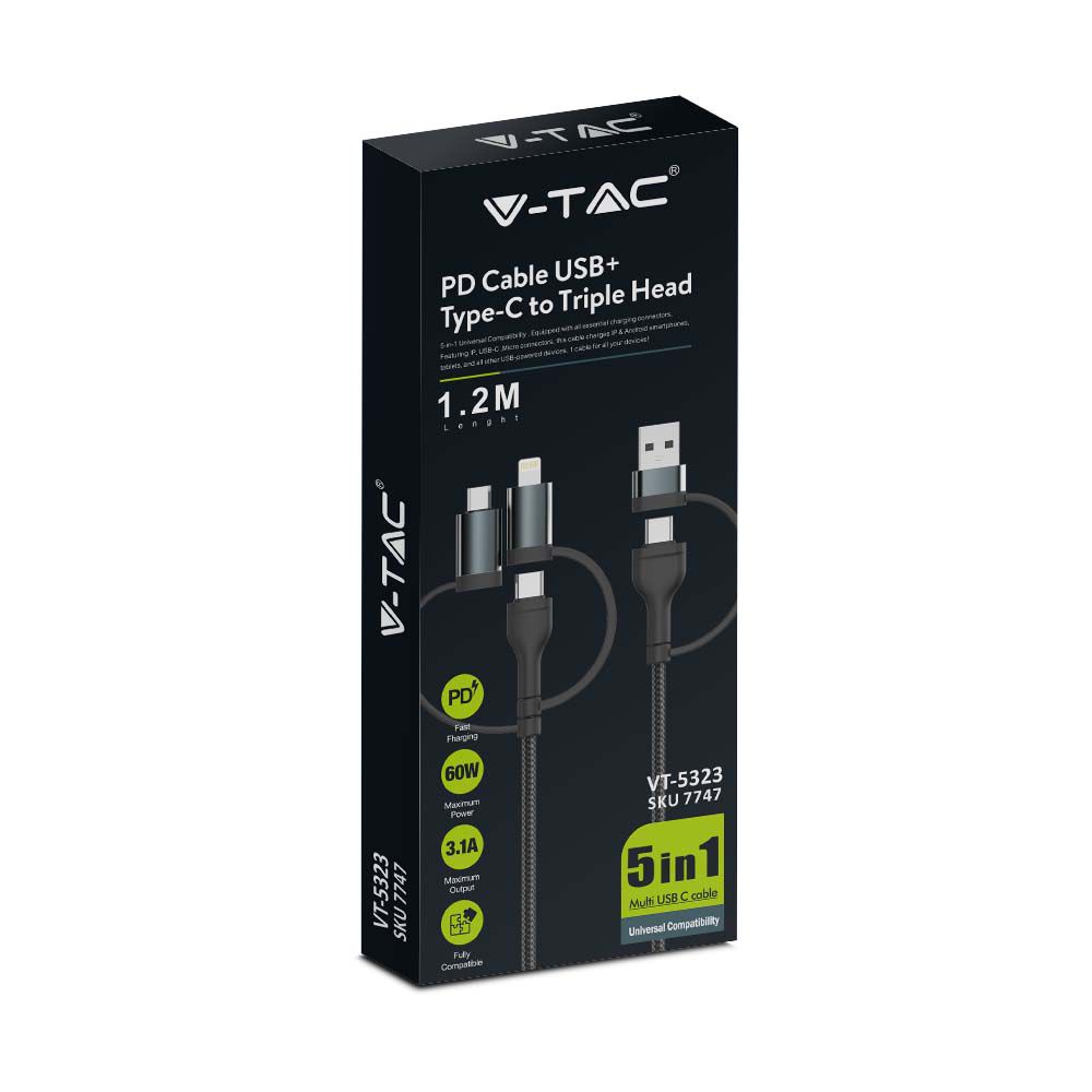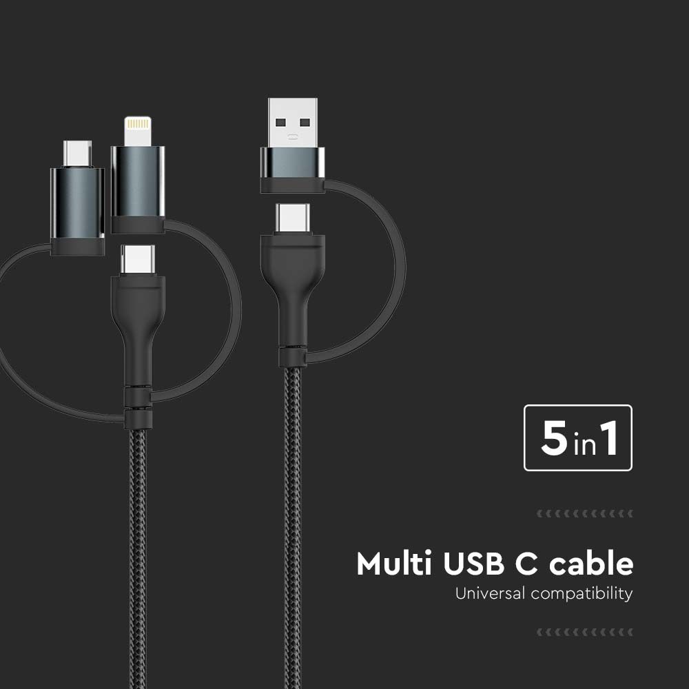 USB Kabel von V-TAC, Modell VT-5323, mit einer maximalen Leistung von 60 Watt. Dieses 5IN1 Multi-USB-Kabel bietet universelle Kompatibilität und ermöglicht schnelles Laden mit 3,1A. Die elegante schwarze Farbgestaltung sorgt für ein ansprechendes Erscheinungsbild. Mit einer Kabellänge von 1,2 Metern ist es vielseitig einsetzbar. Dieses Kabel unterstützt schnelles Laden und ist ideal für verschiedene Geräte.
