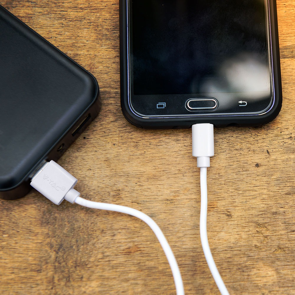 USB Kabel von V-TAC, Modell VT-5301-W, mit einer Leistung von 1,0A. Dieses Kabel eignet sich für Standardaufladungen und Datenübertragungen. Es bietet eine glatte Oberfläche aus PVC-Material und eine effiziente, ergonomische Spitze mit Kupferbeschichtung. Die Maße betragen 15mm x 60mm x 180mm bei einem Gewicht von 0,031kg. Einfaches Einstecken und Herausziehen.