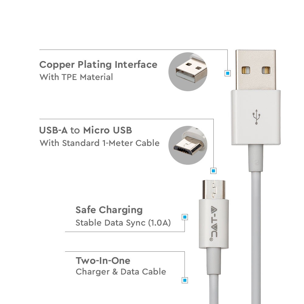USB Kabel von V-TAC, Modell VT-5321-W, mit einer Leistung von 1A. Dieses Kabel eignet sich für den Standard-Ladevorgang und die Datenübertragung. Es bietet eine glatte Oberfläche aus TPE-Material und ist einfach zu stecken und zu ziehen. Die Abmessungen betragen 60 mm in der Länge und 15 mm in der Breite, das Gewicht liegt bei 0,027 kg. Dieses Kabel ist ideal für den Einsatz mit Geräten, die einen Micro USB-Anschluss benötigen.