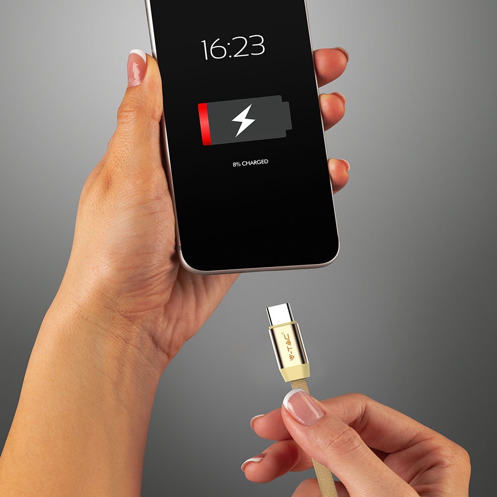 USB Kabel Typ C von V-TAC, Modell VT-5342-G, geeignet für Hochgeschwindigkeitsübertragungen. Das Kabel bietet eine schnelle Synchronisation und schnelles Laden mit 2,4A. Die Lebensdauer und Qualität sind durch die Verwendung von hochwertigem Baumwollmaterial gewährleistet. Maße: 75mm x 15mm x 180mm, Gewicht: 0,038kg. Einfache Handhabung durch leichtes Einstecken und Herausziehen.