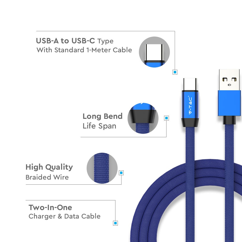 USB Kabel Typ C von V-TAC, Modell VT-5342-BL. Dieses Kabel ermöglicht eine hohe Übertragungsgeschwindigkeit und schnelles Laden mit 2,4A. Es besteht aus einem glatten Material mit Baumwollstoff und bietet eine einfache Handhabung beim Einstecken und Herausziehen. Die Abmessungen betragen 75 mm x 15 mm x 180 mm, das Gewicht liegt bei 0,039 kg.