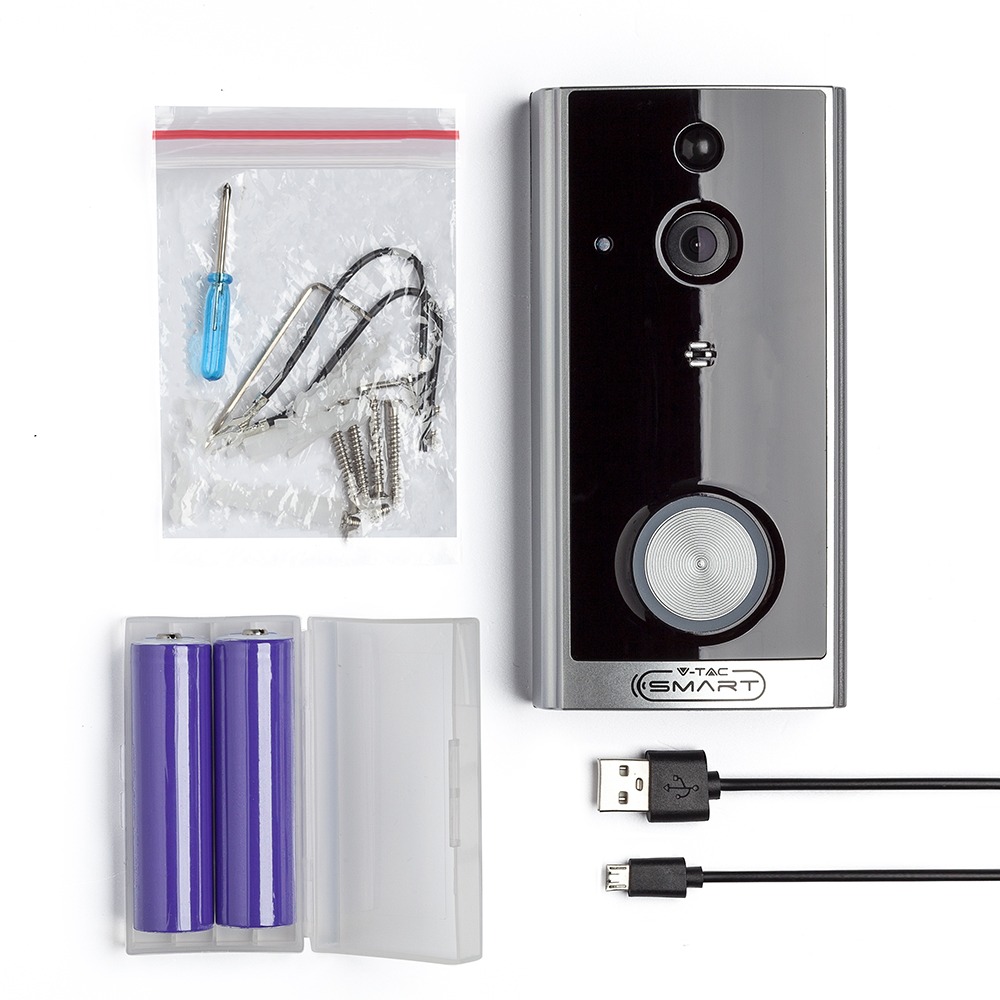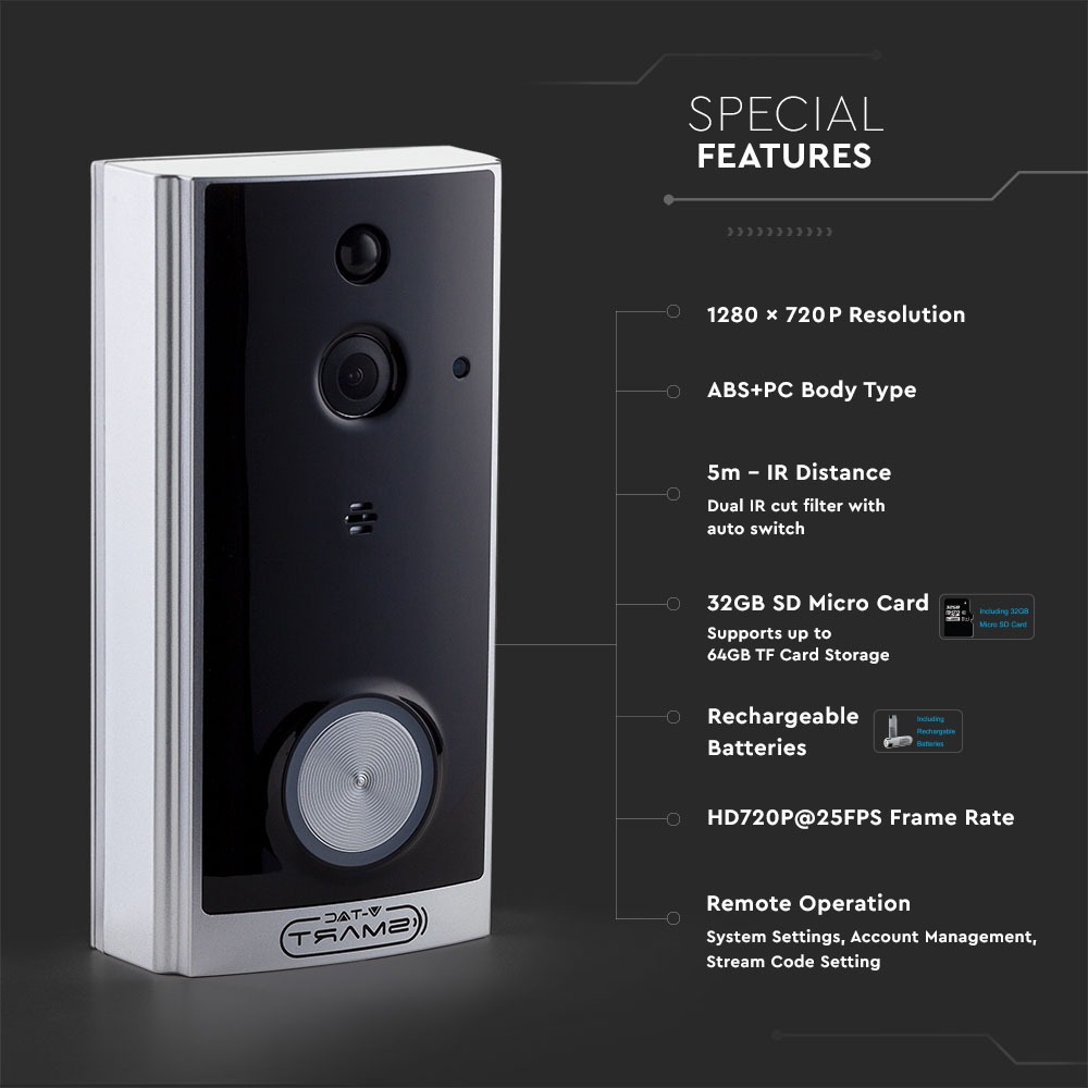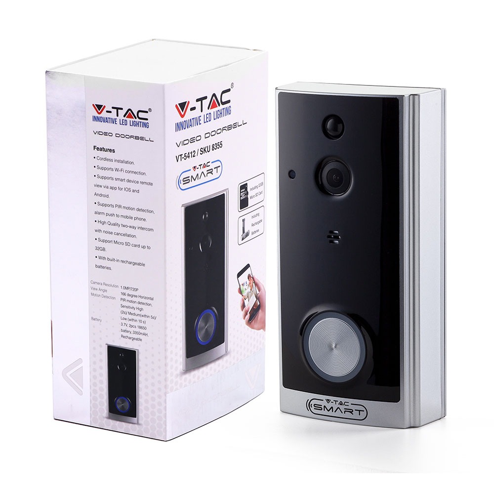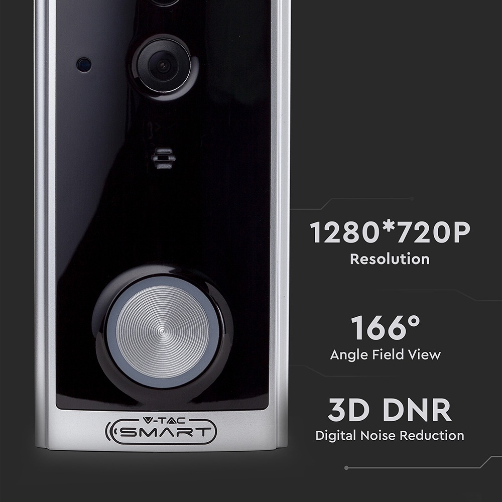Video-Türklingel von V-TAC, Modell VT-5412, mit HD 720p Videoqualität. Die Türklingel bietet eine Auflösung von 1280x720 und einen weiten Betrachtungswinkel von 166°. Sie ist mit einem Bewegungserkennungssystem ausgestattet, das Nutzer mit einer Push-Benachrichtigung alarmiert. Die Montage erfolgt einfach und die Maße betragen 70mm x 100mm x 190mm bei einem Gewicht von 0,524kg. Weitere Merkmale sind die Zwei-Wege-Audiofunktion und die Möglichkeit zur Fernüberwachung über mobile Geräte.